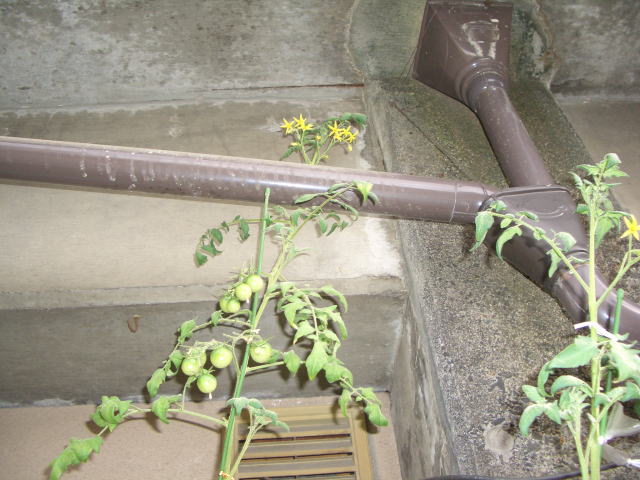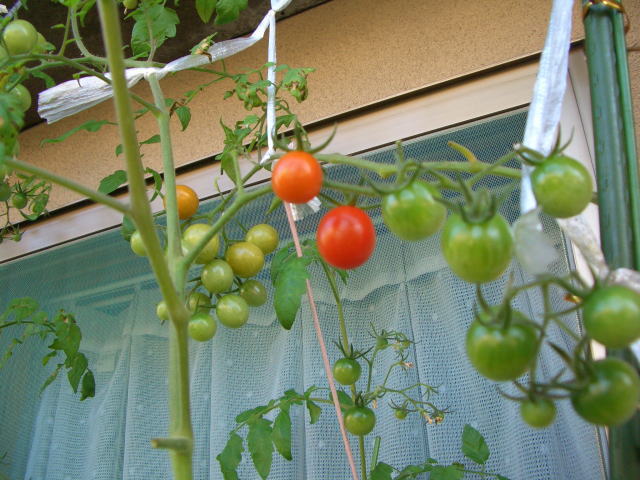 なりました。 …どーしよ~<(@_@;)> 写ってる実を取るのも一苦労な予感。 支柱は継ぎ足しを繰り返してこの高さに。これはこれで大変でした。外からでは届かなくなったので、宅内から窓枠に乗り上がって、枝を折らぬようそっと結ぶ事数回。 この後どうしよう(汗) 芯止めすべきか。(本来もっと早くにすべきかと…) 今年は支柱立てをきっちりし、途中荷造り紐でテキトーをしなかったため見栄えは割といいです。実の付きもいいような気がします。おいしいし。で、はいりはいりふれはいりほー♪もうどうにでもな~れ♪ ついでに。 何故こんないい加減でテキトーな管理で育つのだろう? 今日松本市街地は集中豪雨に見舞われたようです。職場内にいたためイマイチよく判っておりませんでした。帰りに道々積み上げられた土嚢を見、そんなに降ったのかしらと思った位。