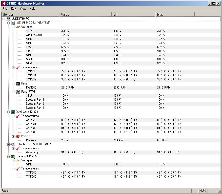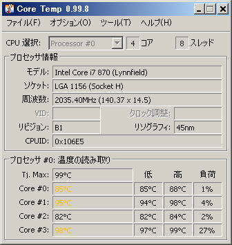 … … … なんすか、この99℃って……………。 … … 計測ソフトがおかしい!絶対おかしい!! なんてこったー(笑) 眠い目擦ってPC立ち上げてアプリ起動して、Ctrl+PrtSc→画像編集ソフトに放り込んで(お薬飲んで)腑に落ちないままシャットダウン。二度寝して危うく遅刻しそうだったのはここだけの話f(^-^;;) …という事で、正確な温度を把握してからCore i7の爆熱対策したいと思いまーす。うーん…M/B付属のCD使って計るべきでした(:D)rzドコイッタ…。 そらそうと検索してみたら、爆熱i7は爆熱仕様なのでそーとー温度高くてもダウンしないみたいっすねー。もちろん寿命には確実に影響しますが。 …あ゛ー、わたしも冷やさないと寿命に影響あるかもー。やっぱ暑いの苦手っすー。今夜ももりもり水風呂に浸かろうと思います…。今年は膀胱炎と熱中症になりませんようにー。 CPUID HWMonitorでCPU温度測定してみました。