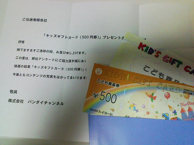こども向けの商品券ですので、それに従ってこども商品購入に充てたいと思います。何買おっかな~♪ 残念なことにポケモンセンターでは使えないみたいです。 至って真っ当な買い物をするハズなのですが、何かがちょっぴり違うような気もしつつ、まあいいや。あ、DS-Liteぶっ壊しちゃったからその購入資金に充てようかな~。(←足りません) 悩むな~。
