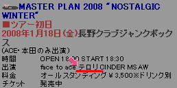 … … …やったろか?(笑)>カップ酒 でも、そうすると帰りの足がない~(T.T)(飲酒運転になってしまうので) ご機嫌の千鳥足で帰ろっかな~。 ウソです。 実は公式発表の前に、「face to aceと対バンするんですよ!」という連絡を頂いたのが12/12。