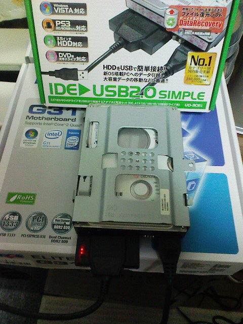 で、初めて書き込みしてみました。多分大丈夫だと思います。思いますんですが…PCのDVDドライブで再生が出来~~~ん!ドライブがCPRMに対応してないみたいです。多分。一応HD-DVD本体では再生出来たのでデータ自体はおっけ~なハズ。しかし互換性については全く不透明なままです。どーなっとるんだ?身近に地デジ録画出来るDVDレコーダ持ってる人いないしなぁ。 …憶える事がいっぱいでアタマがいっぱいいっぱいです。 取り敢えずアレですよ、地デジのメリットは画像が鮮明なだけ。それ以外今のところ良いところが解らんです。使用者のアタマはパーだし、テレビぶっ壊れてるし。←買えよ たとえばかつて、自動車が開発されて便利だと思った時代があったり。電車が通って便利になったと思った時代があったはず。その自動車に当たるものがテレビや冷蔵庫などの家電製品であったり、上下水道であったり、その他にもいろいろとあったと思う。 今回間違いなくぶっ壊れたのは、マザーボードの恐らくブリッジ部。も~どうにもなんなくなってます。取れちゃった( ̄▽ ̄)も~くっつかないよ!部品も飛んでっちゃったよ! その代わり、DVDドライブやHDD、電源ユニットなどは特段問題なくて。液晶モニタは…ちょっと寿命が近かったかもなぁ(焼き付きが見られた) そんなワケで、HDDサルベージ作戦決行。と言っても作業は至って簡単。前のPC分解してHDD取り出して、「UD-301S」というケーブル差して、USB接続で完了。 繋がった時には感動しました。そーそー、アレもコレもバックアップ取ってないじゃないのよ!!どーでもいいものもあるけどさ、そうでないものも…ああよかった~(T.T) …ここで安心していないで、バックアップですね。はいはい。 夕食後。ふと思い立ち。