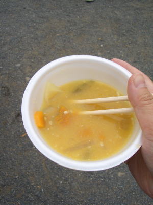 「松本農林業まつり」は、地元産の農産品、花卉等の販売や試食などをするイベント。採れたてキャベツとか卵とか、市価より安く販売されてます。つー事でわたしももりもり積極的参加。張り切って野菜買ってきました。大根に長ネギ、トマト、キャベツにカラーピーマン。100円~200円程度で新鮮な野菜をGet!とっても満足♪ついでに奈川地区特産のパンも買っちゃったりして。奈川地区は市内とはいえ普段行けないので、買えてラッキーでした。 試食コーナーではすいとんと五平餅頂いてきました。 五平餅は、画像残す前に食ってしまいました(爆)正午から配布で、調度お腹が空いてたんだもん!手には大根と長ネギ抱えてたし。こちらはもうちょっと熱々なのを想像してたんですが、あまり熱々ではなく猫舌なわたしでもちょっと残念でした。でも美味しかったで~す。 因みにどちらも松本産の食材を使ってのものでした。 あと、市役所主催の「街かど健康相談」をやっていたので参加。直前病院で血圧測ってもらったばっかりなのに、性懲りもなく無意味に測定。しかもすいとん食直後(^-^;)結果最高血圧114/最低血圧60。褒められました。 今回はアルコールチェック(アルコールの代謝を測るテスト)はしてもらいませんでした。どーせアルコールではなく、アルコールパッチ貼ったテープにしか反応しないも~ん。ええ、ええ、どーせ底なしのザルですよ~だ(笑) 余談ですが。 そーいえば松本城には係員がいるらしく、お城の説明なんかもしてくれてるみたいです。特別料金を取られたりはしないんじゃないかな~?埋橋(うずのはし)付近で観光客に戦国時代の説明をしてました。現存する城では松本城しかない、という物がいくつもあるんだそうで。(すいません、立ち聞きしてしまいました)ま、要約すると「松本城が一番!」(笑) そんなこんなで充実の一日つーか半日でした。