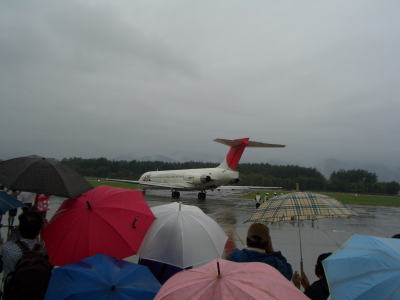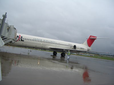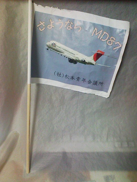 本日は見事に雨。んでもMD-87現役最後つー事で、午後から行ってきました。 わたしのバヤイ、まつもと空港離発着便ではMD-87しか乗った事がありません。今後これしか離発着しないという、巷で話題のボンバルディア社製・Q400は未搭乗。なので想い出はいっぱい。(しかし出足は遅く午後だったり…・笑) 空港に着いて。まず…え~と、どこがイベント入場口なんスかねぇ?なんの案内もなく戸惑いました。取り敢えずうろうろ。スタンプラリーは用紙切れで参加出来ず。まーそんなモンかな~と思ってたら、受付の人に「そんな事はどこにも書いていない」と文句を言う人ひとり。気持ちは解るが人生諦めが肝心だ!(チラシにはよ~く見ると先着って書いてあったんだな、コレが) で、わたしはともかくMD-87が見たかっただけなので今日だけ解放の滑走路へ。既に人ぎっしりで…ま、こんなモンかな~とテキトーに2列目位に陣取って待機。こういう時は傘が視界遮って難儀だな~と思いました。 待つ間に、係員さんと話してる男性との会話に加わったりなんかして。話してるウチに解ったのは、この係員さんはイベントのもの凄く大まかな内容のみ把握しているだけで詳細は知らないという事。聞いているのは「これ以上入らないで下さいね」という指示出すのと、別の人から指示があったら着陸後機体の近くにまで案内していい、という事だけだったみたいで。後は飛行機の離着陸の方向とか(常に北から着陸/北へ離陸)、以前どの便か忘れましたが着陸出来ずセントレアに行っちゃった話とかしました。 …はいいのですが(和やかで)。そんなこんなで雨降ってるモンだから着陸が出来ない! こんな案配で空港上空をぐ~るぐる。一体何回回りましたかねぇ?機影を何度も見ましたですよ。 そうこうするうち、「これで着陸出来なかったら名古屋(セントレア)に行きます」との案内が!最後のチャ~ンス! オジサマ達曰く「視界が良くなってきたから大丈夫じゃねぇ?」 結果。 おー飛行機だ、ジェットだ~♪懐かしいっ! 思えば最後に乗ったのは、face to aceで大阪へ遠征した時かしら?あの時、行きは雪で欠航し(爆)、帰りは強風に煽られて機内から「キャー」ゆー声が聞こえたんだったなぁ………。 … もう、この機には乗れないんだなぁ…しんみり。 そんな事も思い出しつつ、おっけ~が出たので機体近くへ移動。 伊丹や千歳で見るとちっこく見えるMD-87も、こうやってみると大きいような気がするな~。…って書いてて思い出した。伊丹ではこういう扱いしてくれなかったんだった。伊丹空港では搭乗口が一番端な上、ボーディングブリッジ出してくれなくて滑走路歩いたんだった…まだジェットだったのに~。扱いがその頃からひでぇ!(T.T) 搭乗客を降ろした所で、ミス松本から機長さんに花束贈呈とかちょっとしたセレモニーをやってました。雨の中、傘もささずにお疲れ様です。 んで、遂に最後の離陸の時が。という事で見やすい位置に適宜移動~。 ココでわたしが見たものは、大の大人(男)三人の口喧嘩。傘から水が滴るとか、わざと見えなくして意地悪してるとか、オレの方が先にいたとか、なんだその言い方はとかとかとか…。マジ切れしてました。後ろで見ていたわたしは、殴り合いとかなったらどうしようかとドキドキ…。仲裁する気は全くなし。おっかなかったんだも~ん。 …この人達は航空マニアな方々なんでしょうかねぇ?「(ジェットの音録音してるのに)テメェの声が入っちまうじゃねーかよ!」って文句言ってましたもの。最後には一応「悪かった」で握手と相成りましたが…う~ん、飛行機マニアは怖い…という印象が。 ンなワケでおっかないので移動(^-^;)なんかの鋼鉄製の機材の上に陣取る事が出来ました。 (ジェット離陸時の、あの「これからが本気じゃあ!」ぐおーーーーーーーいう音がニガテです。ヤな汗が出ます。) 着陸時同様、離陸の瞬間も見逃しましたが(爆)、しっかり眺められました。 着陸に時間が掛かったため、小一時間ほど押して離陸と相成りました。 その後航空券の抽選を眺めつつ(もちろんハズレ)、早々に引き上げる人を尻目に、どうせならという事でQ400の離陸も眺める事に。 雨降りな上、ジェットが押し押しで飛び立って行った事もあり、日暮れ間近の送迎デッキ(今日だけ無料、普段は大人100円)は人まばら。見放題っすよ!(笑) 雨降りの時、ボーディングブリッジ使えないプロペラ機のバヤイ、搭乗口から飛行機までどうやって移動するのだろう(傘どーすんの?)と思って見ていたら、ちゃ~んと「JAL」文字入りの専用傘があって(ツノはなし)、それを一時差して移動するんですね~。へ~へ~へ~。 あと、離陸の時は片側(正面向かって左)のプロペラから正常に回るか確認し、両方回して始めて離陸するんですね~。わたしが乗った時は全便ジェットだったんで初見、興味深かったです。プロペラ機はまだ乗っていないんで…いつか乗るかなぁ?(汗) で、このQ400離陸は動画として録画しました。どーするのか、それは不明。