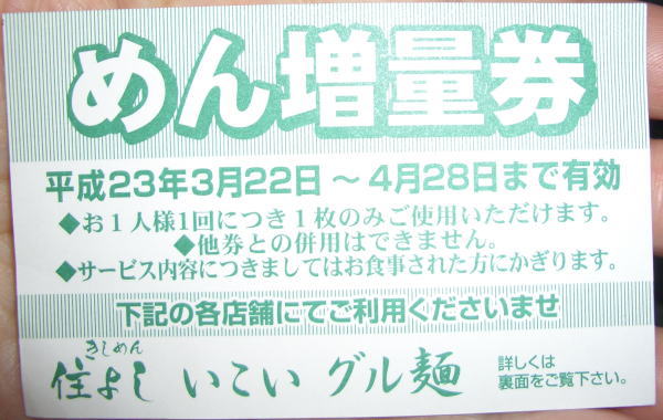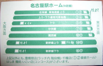 アポロシアター後にして、最寄り新栄駅から一駅で千種駅へ(やっぱ電車は楽♪乗り換えは千種が一番♪)。回数券を指定席にする機械が見当たらず、窓口で訊いてみたら…うーん、テレビでよく見る某河村市長と似た語調で「さっき行ったばっかりだから、次のでいいかね?」 …il||li(ФДФ;)がーん 間に合うと思っとったがやーーーーーーー!←対抗してみました 「あら行っちゃいました!?あー…次のでいいです」(っていうか、イヤです前のに乗りたいですっ!!!!!て言った所でどうにもならんてー・笑) という事で千種駅で…どうしましょう小一時間。 うー、こんな事なら会場で一緒になった友達とお茶すれば良かったorz 普通列車かなんかで名古屋駅に移動して、お土産買い漁ろうかしらとか思いましたけど…(赤福買いたかった)お土産買っても食べ物だと食べきる自信ないし、移動して買うんだったら最初から名古屋駅行けば良かった事だし…そんな訳でここでだらだら時間潰す事に(笑) とにかくヒマでぇ~。 寒くはないんだけど花粉飛んでいて避難はしたい…ふと見たら立ち食いそば屋さんが☆うどんなら食べられそうだし、名古屋できしめんはアリでしょう♪れっつごー! 立ち食いそば・うどんはもうかれこれ随分前、記憶にない位久々。 食べたら……おいちかった☆んまいっ!猫舌だけど、はふはふしながら頂きました。 ここの所の体調不良で食べる物が美味しいって全然思わなかったし、完食できなかったらどうしよう(残すのは閣下のお話聞いてるのと自分のポリシーががっちり合ってるので絶対イヤ)と思ってたんですが、全部食べられましたヽ(´∀`*)ノヽ(*´∀`)ノ いろいろとご馳走様でした♪ んでー。 ありがとうございます♪って頂いてきたんですけども…。 … 名古屋に行く予定がない(よな、きっと…たぶん。アポロシアター前で別バンドの、このホールでの別の月の公演案内がE-mailで来たけども)のと、めん増量されたらたぶん残しちゃうだろうって事で…(汗) 無駄にしてゴメンナサイ(;ω人)(予告) CANTA FCイベント(名前忘れた)行って来ました!ヽ(´∀`*)ノヽ(*´∀`)ノ