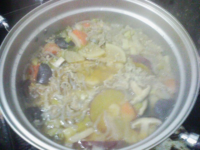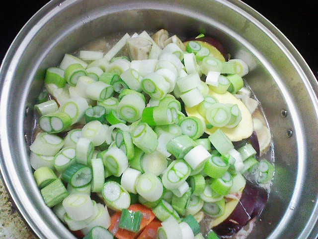 今回は具体的にどのようなオソロシイシロモノなのかを紹介したいと思います。画像付きで。 材料 : だし汁、豚肉、サツマイモ、大根、ニンジン、ゴボウ、突きこんにゃく、椎茸、ねぎ、砂糖、味噌 量は全てテキトー(^-^;)ですが、大雑把に、だし汁1,200cc、豚肉200~300g、サツマイモ1本、大根10cm、ニンジン1~2本、ゴボウ30cm位のを2~3本、突きこんにゃく一袋、椎茸1パック、ネギ2~3本、砂糖と味噌は本当にテキトー …ネギ汁ではありませんよぉ~。 ネギ大好きなのでこのようになっちゃいました。 で、アクはこまめにとって、煮立ったら砂糖と味噌で味付けてコトコト煮ます。 掃除や片付けなどをしながら煮込む事?分。 完成。 コレを週間位掛けて食べ続けます。医師にも笑われるこの食べ物は、お腹にとってもいいようです。 因みにこちらは比較の図。 これから入れる予定の椎茸と鍋を比べてみました。 あまり大きく見えないかも知れませんが、このお鍋はウチで一番大きな鍋です。 …今週は金曜日までに食べ尽くさねば(汗) 植え替えました、数年振りに。