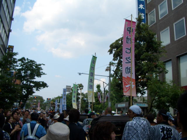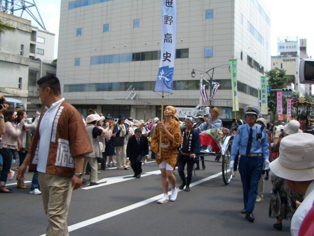 ところで「お練り」って何? …帰ってきてから調べました(^-^;)なるほど~。 権利関係で問題があるといけませんので、うっすら雰囲気の判りそうな画像をいくつか。 こんな感じで役者さんが人力車に乗り、街中を練る、それが「お練り」(で合ってると思う)。 今回先頭は地元の舞台(山車)。日頃見慣れているのでさほど感動はしませんでした。例年の行事ではもっと台数多いし。 中村勘三郎さんを初めとした役者さんは笑顔で沿道の声援に応えてくれました。わたしには屋号が解りませんでした…が、頂いた「かわら版」なるチラシに屋号が書いてありました。因みに気付いたのは終わってから。意味ねぇ~(笑) …え~と、問題なさそうだとこんなになってしまいます(^-^;) のぼりが歌舞伎ですね~。 ついでなので松本城でのセレモニーも見てきました。一座の皆さんのご挨拶を生で聞いていたら舞台も見たくなりました。すっごくすっごく楽しそうでした。う~…今回は無理っぽいので是非また来て頂きましょう。 笹野さんのご挨拶での着ぐるみの話(アル○ちゃん)には笑いました。アルプちゃんはアルプちゃんです(司会進行のおねーさん談)。 あと、去年の夏大相撲松本場所で見た市長も約一年振りに見ました。来年は何でしょう? 余談。 何がって、暑くて死んじゃいそーでした!今日の最高気温は33.8℃。水分補修はしていましたが、ちょっと暑さで具合が悪くなりました。汗があまり出ず、身体は熱いままで頭痛がした程度ですが。鎮痛剤飲んで夜シャワー浴びたら、不調はだいぶ解消しました。これからゆっくり休みます。 あと紫外線アレルギーなもので、当然ながらトホホな顔になりました(T▽T)でも自宅にはちゃ~んとお薬があります♪しっかりケアしたので…まー何かあっても月曜日まで待てるでしょう。 それと! 人多すぎ!!(笑) 一体どこから出てきたのって位、人がいた!!(おめーもその一人だろうというツッコミはさておき) 炎天下にお疲れ様です。 ちょっと苦言を。 願わくば、人が集まりそうな所では日傘はやめて欲しいです。邪魔なのはもちろんですが、2度ほど日傘の骨がアタマに当たりました。危険です。せめて帽子とか、上着着るとか、日焼け止め塗るとか、他の人にいろいろと影響を与えない方法で紫外線対策して下さい。 去年秋購入したウチのDVDレコーダ「ハードディスク搭載DVDレコーダー「スゴ録」|RDZ-D700」